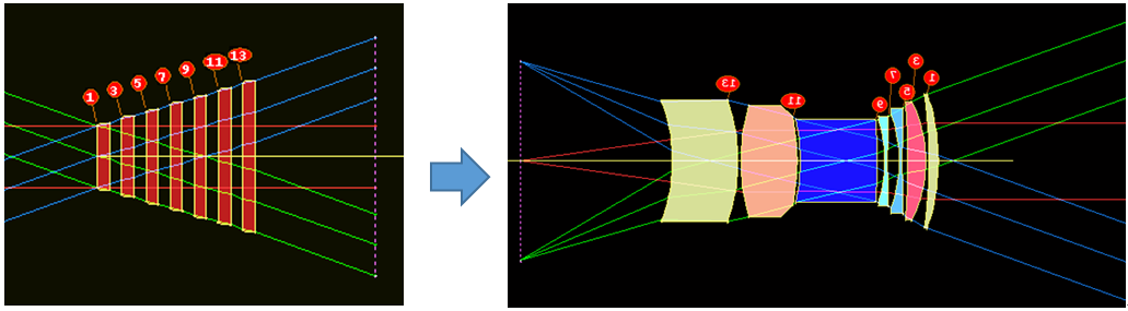 镜头搜索功能: 输入所要设计的系统的使用波长、相对孔径,视场等参数,软件即可从自带的镜头库中找出相应的结构以供选择。