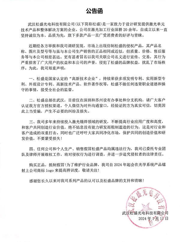 武汉松盛光电科技有限公司(以下简称松盛)是一家致力于设计研发提供激光单元技术产品和整体解决方案的企业。公司在激光加工行业深耕20余年,自成立以来一直坚持诚信为本、品质为先,旗下多款产品一直广受消费者的好评与青睐。
