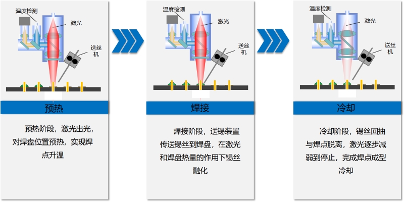 在解析上述的要点之前,我们先简单的过一遍激光锡丝焊的原理,一般来说通过三个阶段:预热--焊接--冷却。
