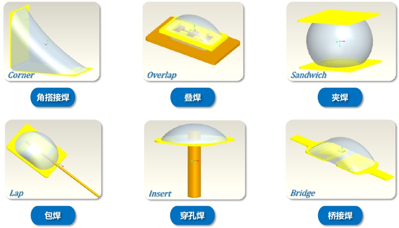 激光锡焊常见的结构一般有以下六种(如图),分别为角搭接焊Corner、叠焊Overlap、夹焊Sandwich、包焊Lap、穿孔焊Insert和桥接焊Bridge。