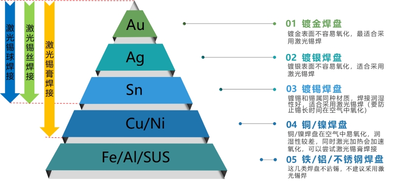 其中镀金,镀银,镀锡焊盘最适合激光锡焊,上述提到的三个锡焊工艺都适用,而铜/镍焊盘在空气中易氧化。润湿性较差,同时激光加热会加速氧化,可以尝试用激光锡膏焊接工艺。最后提到的铁/铝/不锈钢焊盘因为不沾锡,故不建议使用激光锡焊。